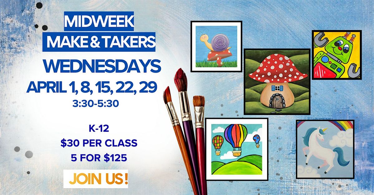 Midweek Make & Takers is a weekly kids acrylic painting class designed to build creativity, confidence, and foundational art skills in a fun, supportive environment.