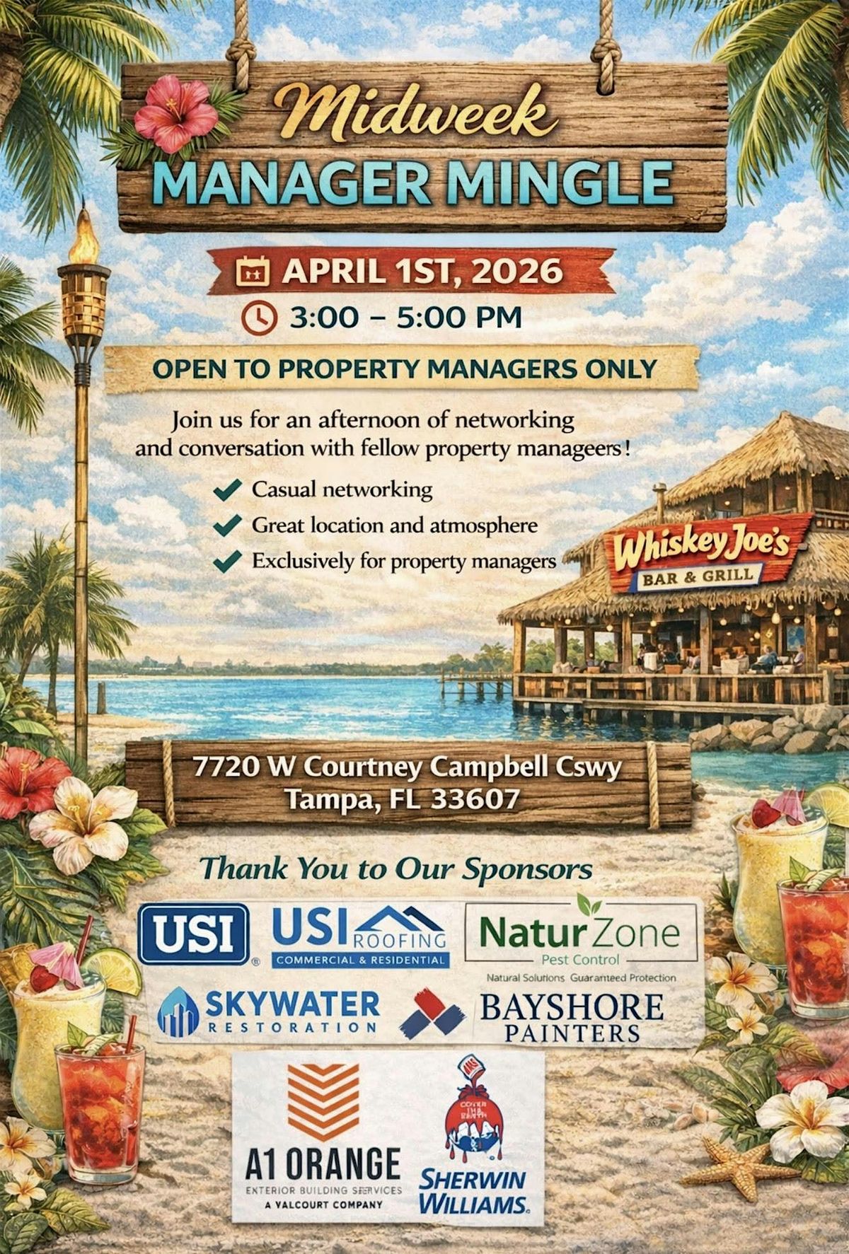 Join us for the April edition of the Midweek Manager Mingle at Whiskey Joe’s — a casual, waterfront afternoon with great people, food, and drinks.