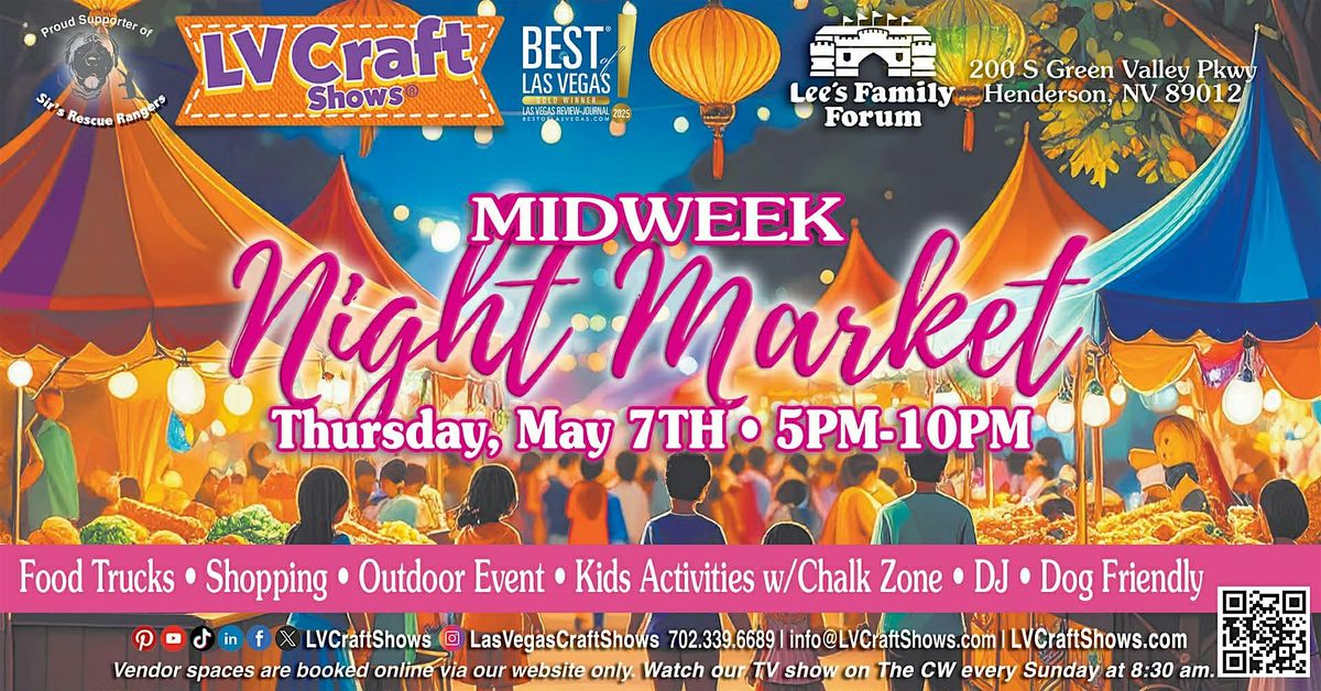 Welcome to the Midweek Night Market happening outside at Lee's Family Forum on Thursday, May 7th at 5:00 PM! Get ready for an evening filled with delicious food, unique crafts, and entertainment.