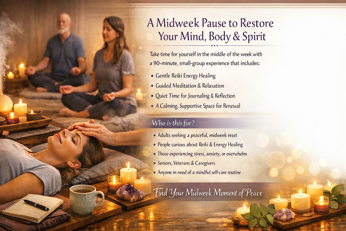 Take time for yourself in the middle of the week with this 90-minute, small-group experience combining gentle Reiki energy healing, guided relaxation, and peaceful personal time in a nurturing space. Each week features a unique theme to inspire your reset and help you carry calm into the rest of your week.