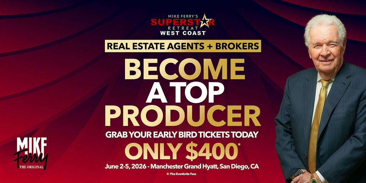 Join Mike Ferry and top industry coaches for 5 days of intensive real estate training in San Diego. With a Bonus Day on Monday plus 4 full days of prospecting, listings, scripts, and closing sessions, you'll walk away with proven strategies from the Mike Ferry Sales System — trusted by agents for over 50 years — and actionable tools ready to implement the moment you get home. Save $100 when you register today.
