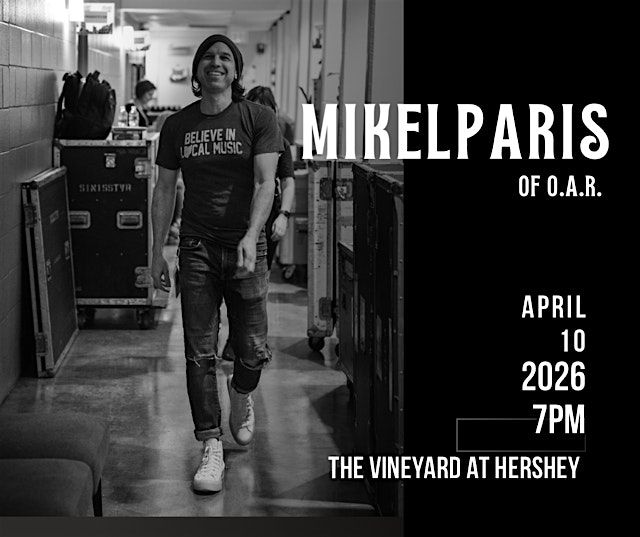 MikelParis.O.A.R. keyboardist, Stomp Alumnus and songwriter return to The Vineyard at Hershey for an intimate night of performance and connection. You won't want to miss out on his guitar drumming, which is truly mesmorizing.
