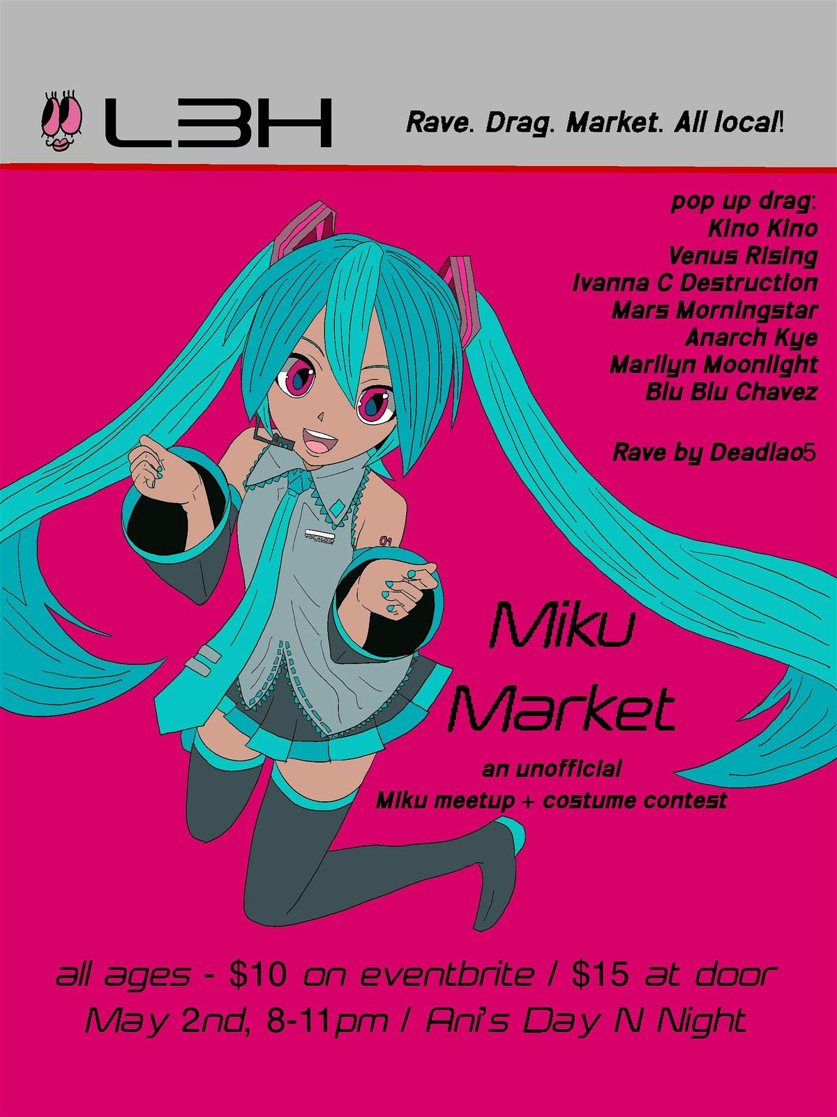 Rave, vendor market and pop up drag! Come in your best Miku cosplay for a costume contest!
