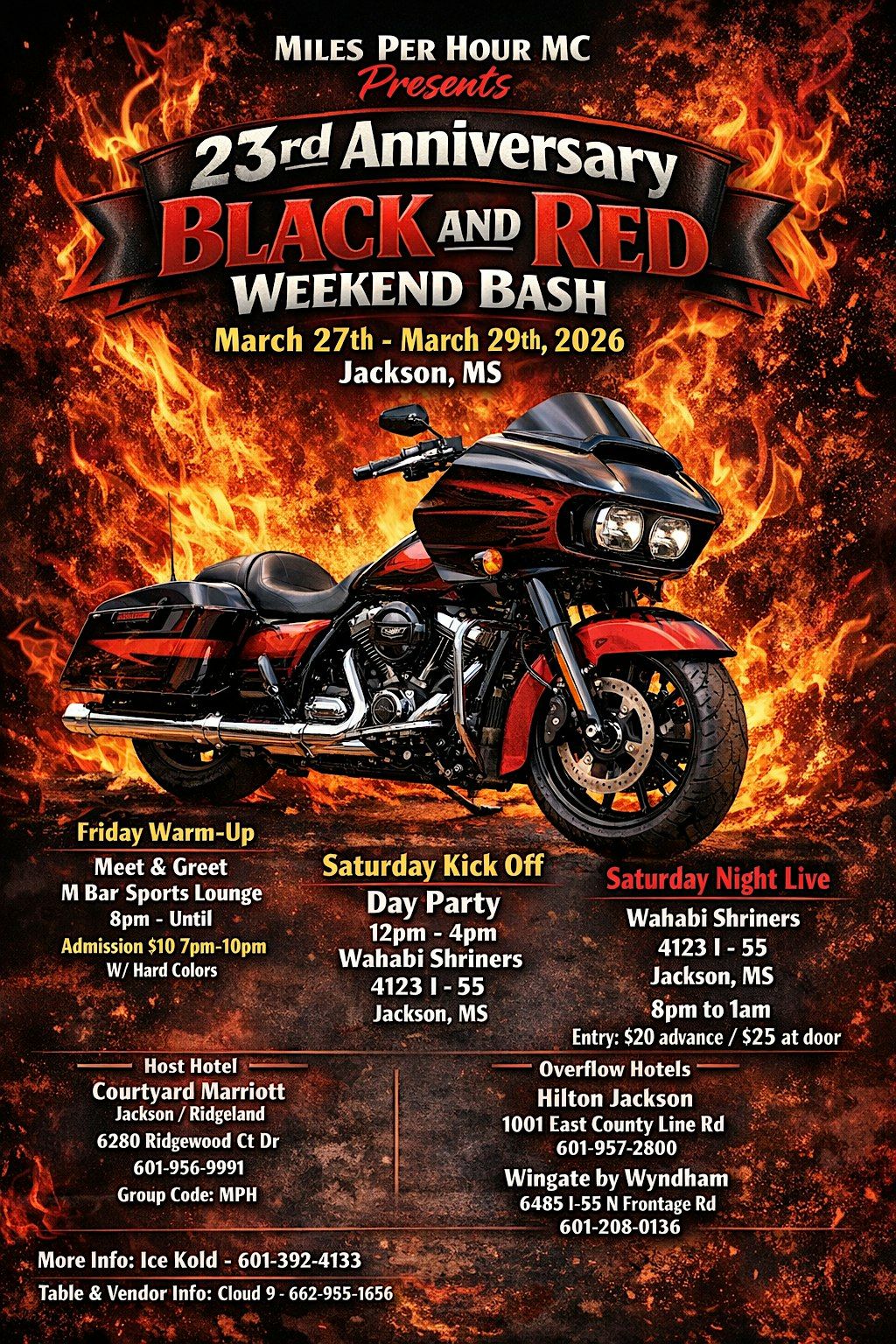Welcome to the Miles Per Hour MC 23rd Anniversary Weekend Bash! Get ready to celebrate with us at M Bar Sports Lounge n March 27, 2026 at 7:00 PM (Central Time). Join us for an evening filled with music, food, and good vibes. Don't miss out on this special occasion as we mark another amazing year together. We will have a day of fun games and laughs at the Day Party 12pm-4pm Wahabi Shiners I-55 S. We will close out the weekend with the finale to set it all off at the annual dance at the Wahabi Shiners starting at 9 pm!! Let's make memories that will last a lifetime! Don't say we didn't warn you!!