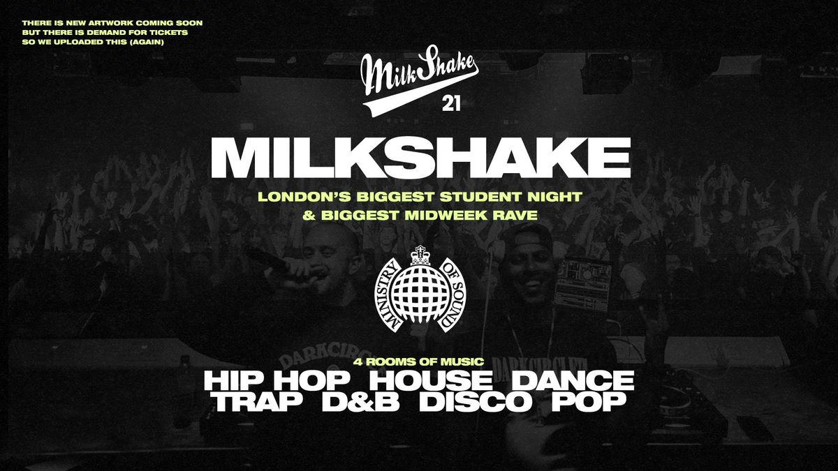 Milkshake, London's Biggest Student Night 🌍Running 23 Years Strong, Since 2002 Tuesday - March 24th 2026At The World Famous Ministry of Sound 🔥Doors open 10:30pm 👀 🎈⚠️ WARNING WARNING WARNING - SINCE CLUBS RE OPENED IN JULY 2021, THE NIGHTLIFE IN LONDON HAS BEEN INSANE, WITH OUR FLAGSHIP EVENT SEEING NEARLY 2000 PEOPLE IN MINISTRY OF SOUND WEEK IN WEEK OUT ⚠️⚠️Seriously though, what the f*ck else are you going to do on a Tuesday Night in London?Come see ya mates get wavey init 🌊 (PS We're now doing tables, see the bottom)  ---------------------------------------------------------
