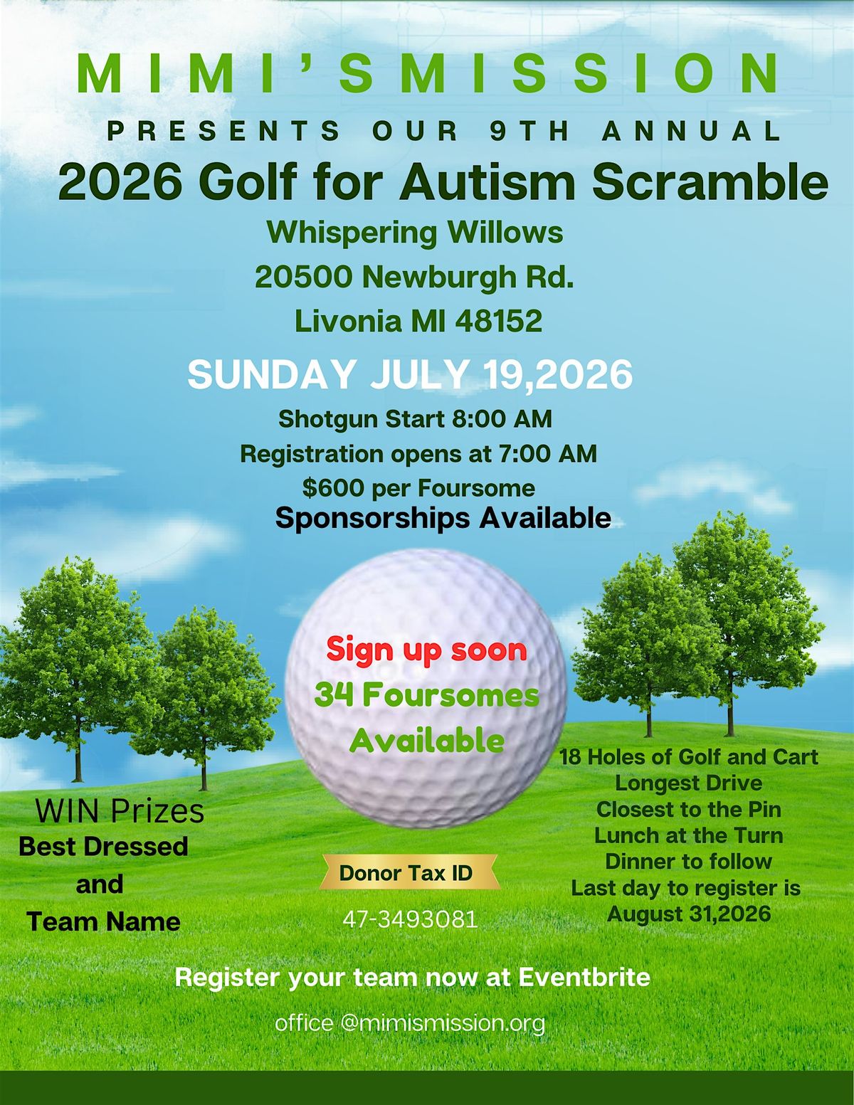 Make sure you have your best TEAM Name and are the best dressed to win those prizes. Registration begins at 7am with the shot gun start at 8am, player welcome bag , lunch on the turn followed by a delicious buffet dinner. We will have some awesome raffle items, a 50/50 and a lottery scratch off tree raffle- all $20 each to participate. And don't forget longest drive, closest to the pin, skins & mulligans. Along with course surpirses.