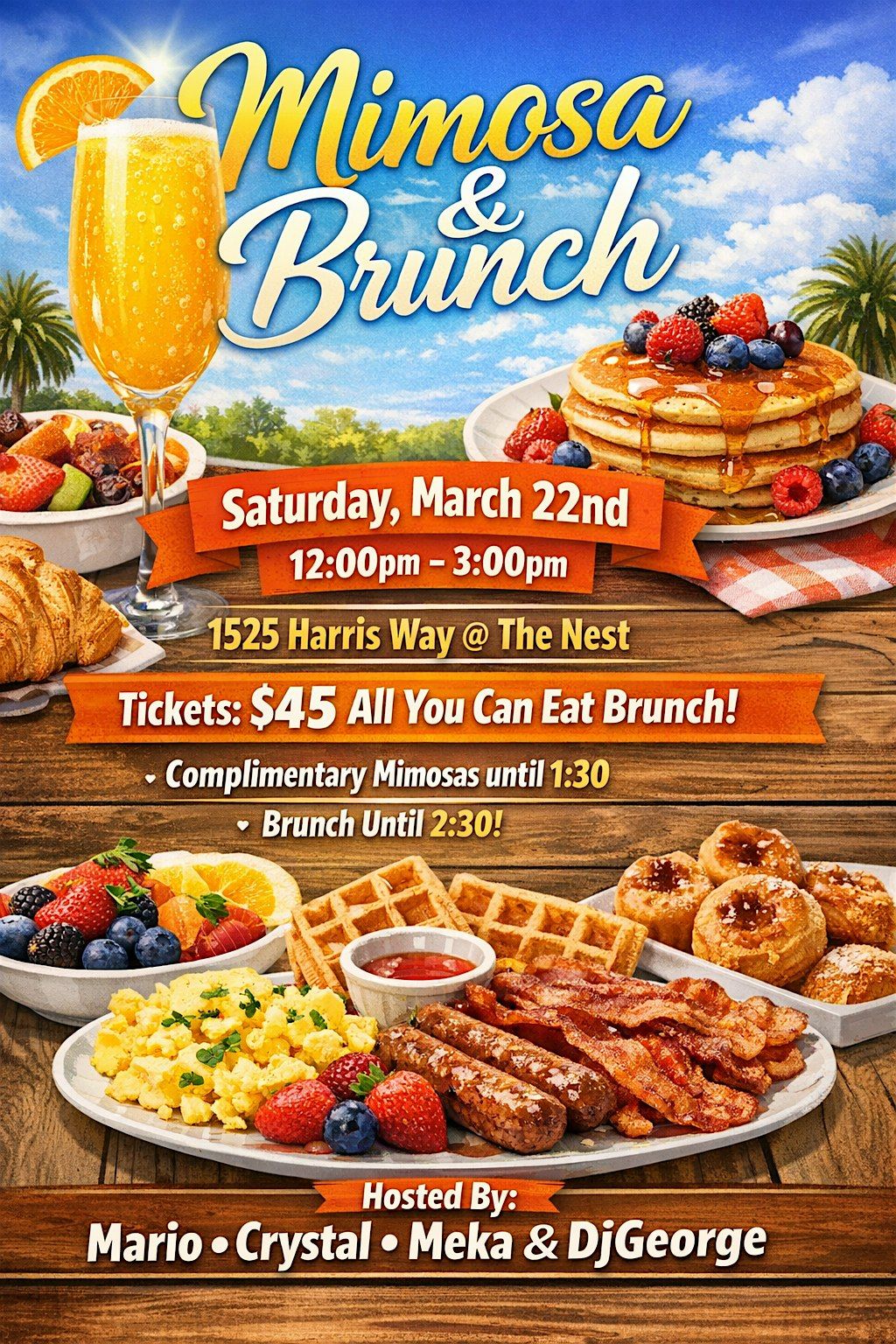 Join us March 22nd from 12:00 pm until 3:00pm @The Nest for a delicious all you can eat brunch experienc. Enjoy complimentary mimosas until 1:30 while you mix and mingle and indulge in great food.