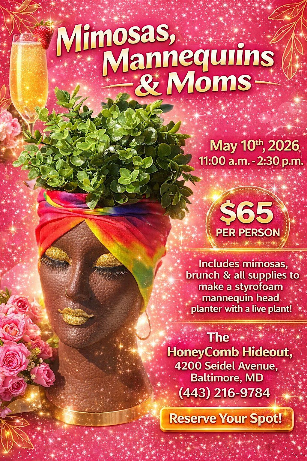 Welcome to Mimosas, Mannequins & Moms at The Honeycomb Hideout! Get ready for a fun day out with your favorite ladies. Sip on refreshing mimosas, brunch and get creative as we transform styrofoam mannequin heads into stunning custom planters — the perfect keepsake to celebrate all the amazing moms in your life. It’s a stylish mix of hands-on fun, flair, and unforgettable memories you won’t want to miss. 💐🥂