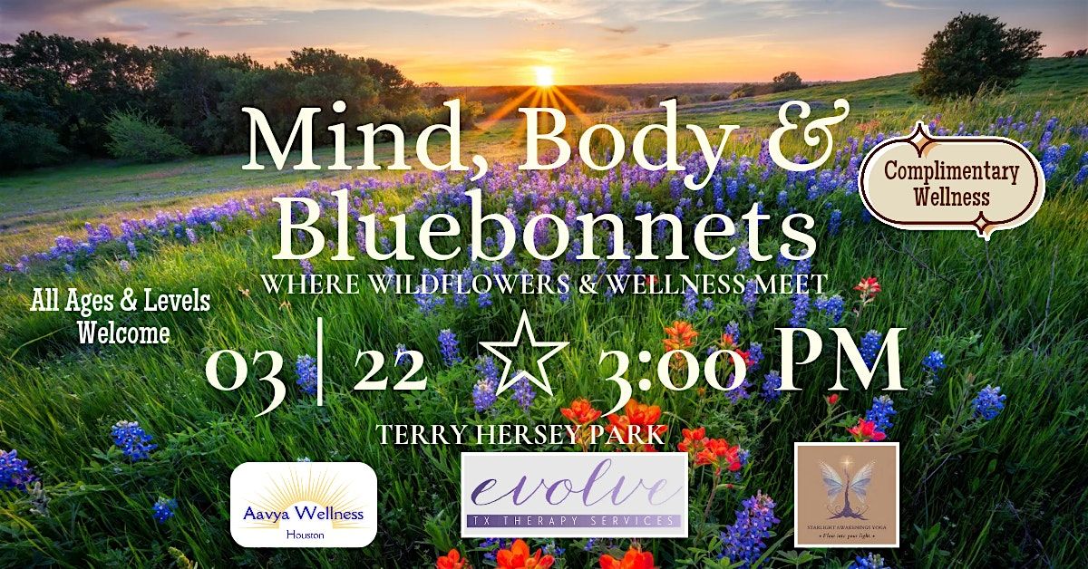 Welcome to the Body, Mind, & Bluebonnets event! Join us at Terry Hersey Park on 3/22 at 3:00 PM for a rejuvenating experience.