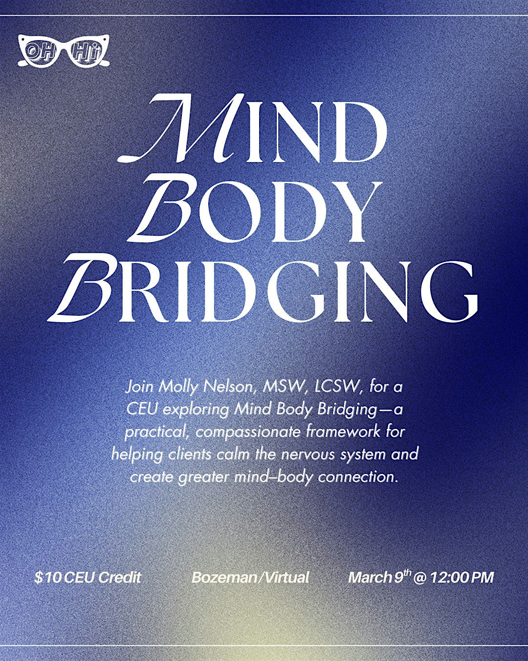 Join Molly Nelson, MSW, LCSW, for a CEU exploring Mind Body Bridging—a practical, compassionate framework for helping clients calm the nervous system and create greater mind–body connection.