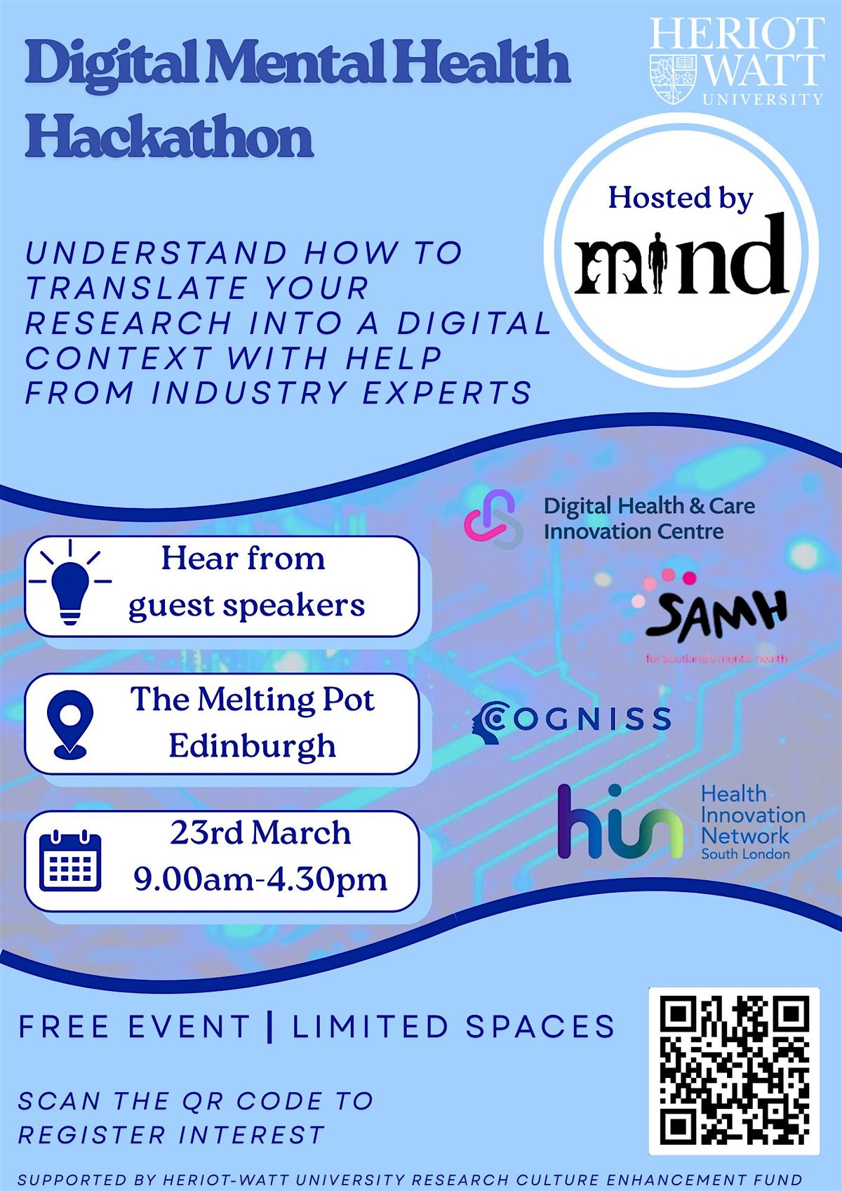 It will bring together HWU researchers from any discipline and individuals with lived experience from the community for a full-day programme that begins with an introduction to the current digital mental health research landscape, followed by a co-design session where research teams collaborate with individuals with lived experience to identify priority challenges. If you are a researcher with an interest in mental health and are curious about how digital tools might support your research, this is an event for you!
