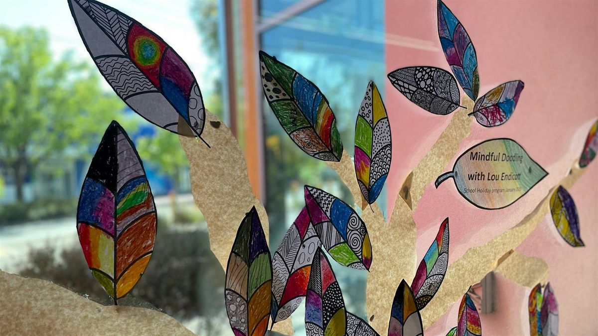 Image: Hand coloured, patterned leaf shapes grouped together in a window display. One leaf has text saying Mindful Doodling with Lou Endicott.