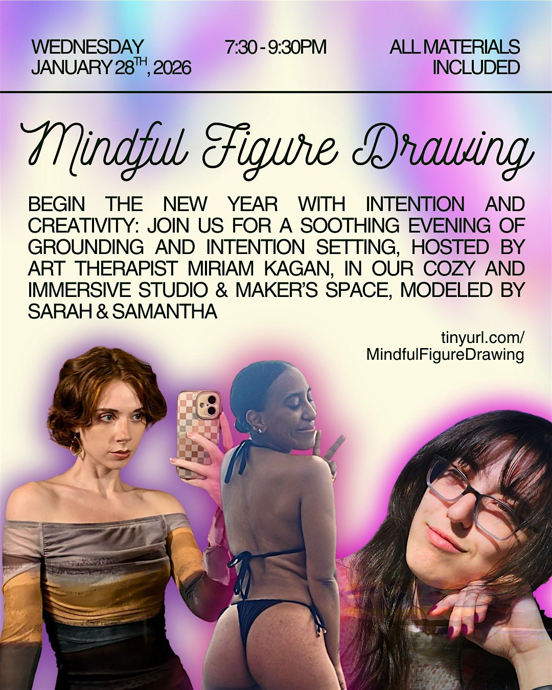 Begin the new year with intention and creativity. This Mindful Figure Drawing session opens with a guided meditation led by art therapist Miriam Kagan, followed by a 1-hour nude figure drawing experience with two models in a supportive group setting. This wellness workshop invites you to ground yourself, set intentions for the year ahead, and connect with like-minded peers through meditative art-making.