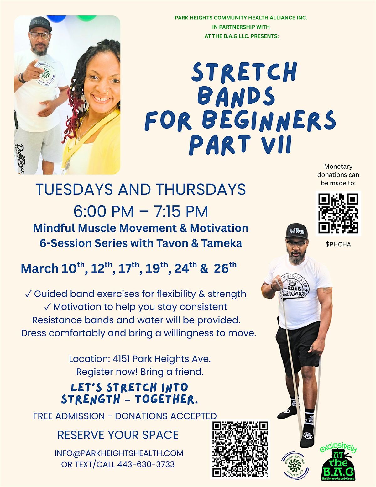 Welcome to Mindful Muscle Movement & Motivation—our 6-session series returns! Join us on Tuesdays & Thursdays, March 10th, 12th, 17th, 19th, 24th & 26th 2026, at 6:00 PM at 4151 Park Heights Ave for another series of evening fitness, inspiration, and community.