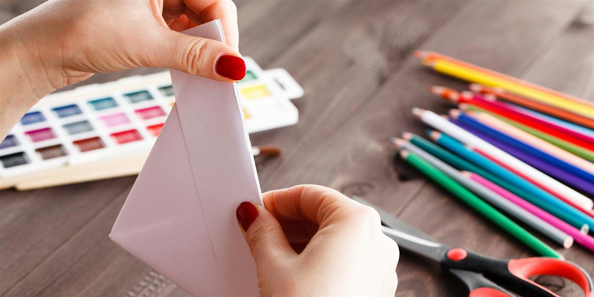 Image: A close-up of two hands folding a piece of paper at a table covered with coloured pencils, a pair of scissors and water colour palette.