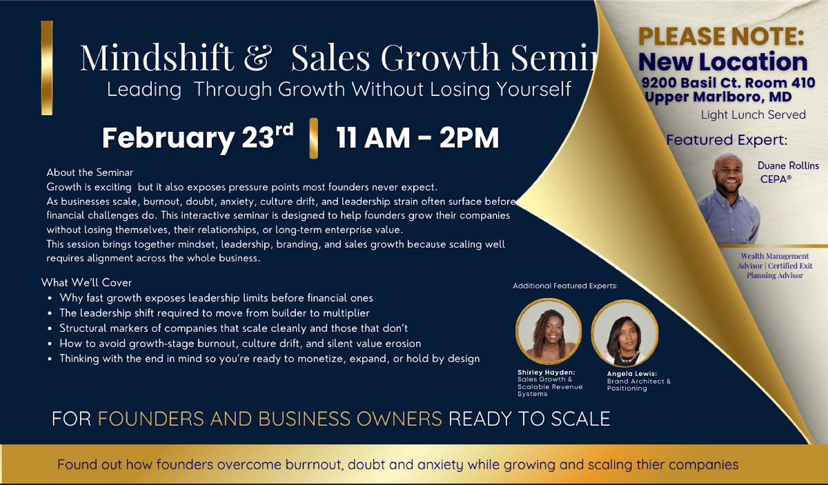 As businesses scale, burnout, doubt, anxiety, culture drift, and leadership strain often surface before financial challenges do. This interactive seminar is designed to help founders grow their companies without losing themselves, their relationships, or long-term enterprise value.