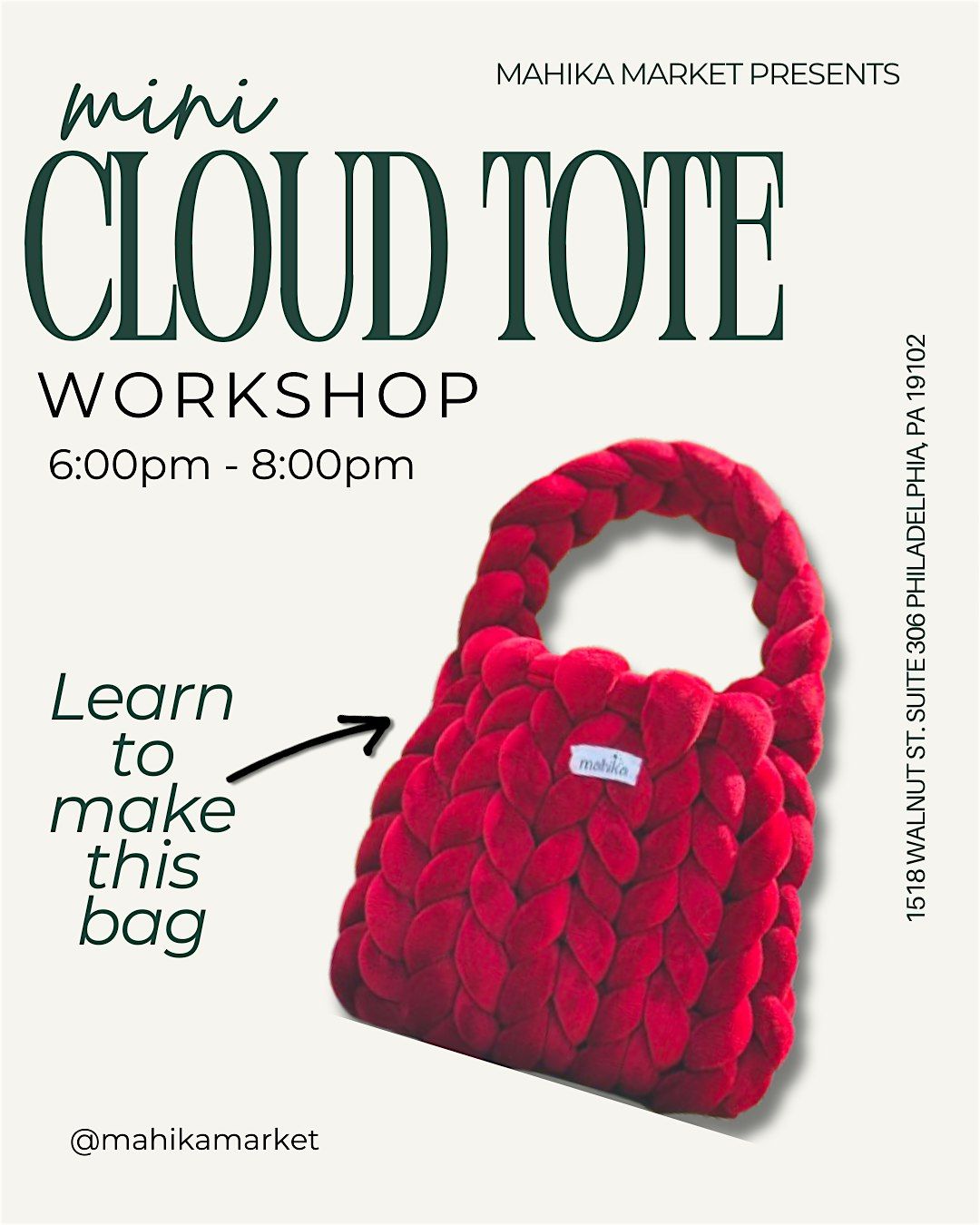 Join our Mini Cloud Tote Bag Making Workshop and learn how to create your very own stylish bag from scratch! Pick from an array of colors and leave with a finished product that was made completely by YOU! This is an in-person event where you'll get hands-on guidance, all the materials you need, and a fun, relaxed vibe. Perfect for all skill levels. We will be finger-knitting, so no knitting needle or crochet hook needed!