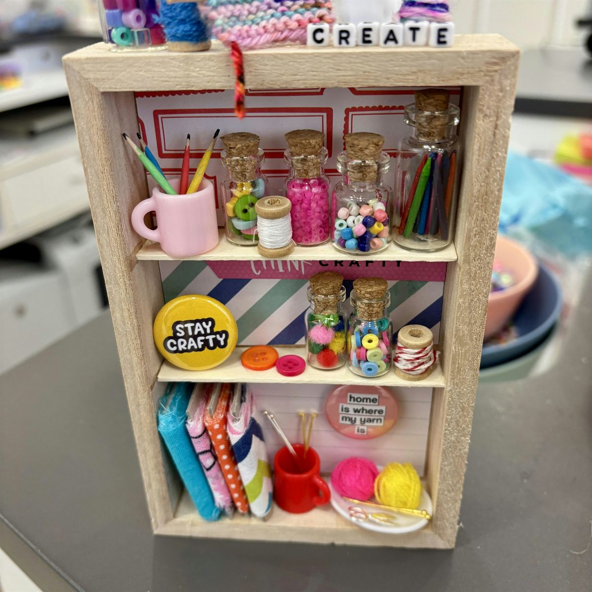 Fill your shelf with teeny craft supplies, as well as the books, plants and other tiny items you’ve loved in our previous workshops. We’re using a slightly different shelf base this time, so you can try some new ideas. (No one is forcing you to create a craft room, BTW. All that’s required is a love of tiny things and some creativity.)