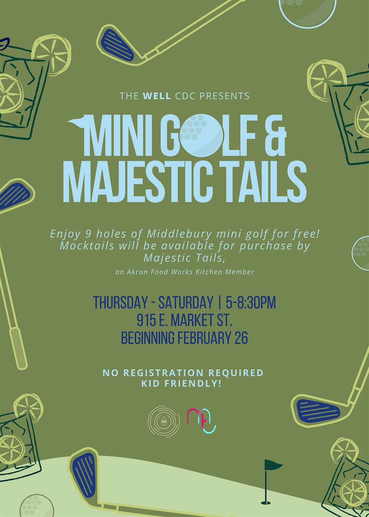 Majestic Tails is hosting a pop up mocktail experience at mini golf in the Middlebury neighborhood. Guests can enjoy handcrafted alcohol free beverages made with housemade syrups and fresh ingredients while spending time with friends, family, and the community.