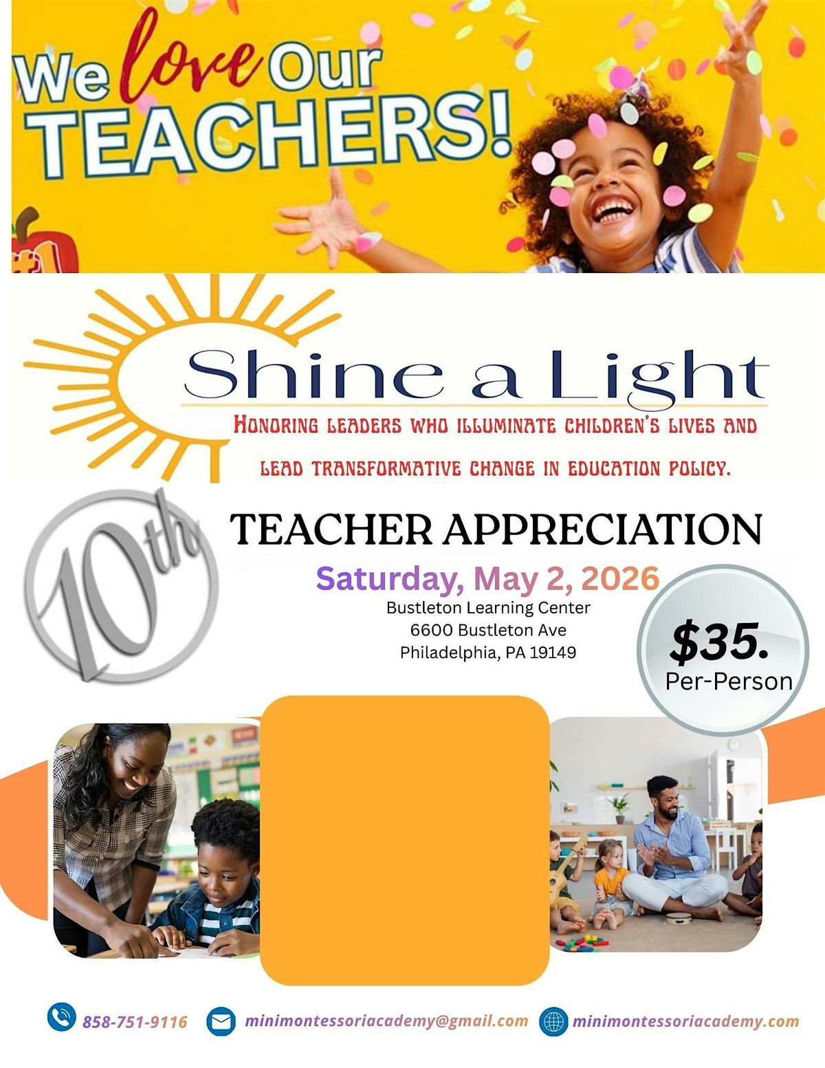 Mini Montessori will be celebrating those who touch lives, spark curiosity, and inspire greatness at the10th Year Teacher Appreciation.Agenda