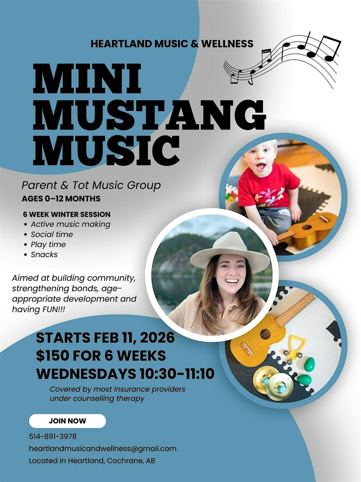 Get ready to jam out at Mini Mustang Music — an awesome in-person event where little ones and their parents can connect, make music, and exercise their quickly developing brains! There will be active music making, time to connect, snacks, and a supportive home atmosphere for real relationships to be formed. This group is run by Laura MacLeod, a certified music therapist and counselling therapist. This service is covered by most benefit providers under counselling therapy. $25/class or $150 for all 6 classes. Invoice will be sent once you reserve your spot on Eventbrite.