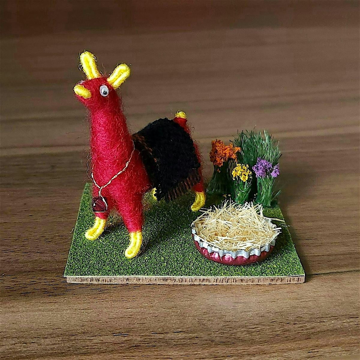 In this class you will learn to needle felt a miniature alpaca. It will have a wire frame inside making it poseable. You will also get to dress the alpaca up and decorate a small patch of grass for your little friend to live on.