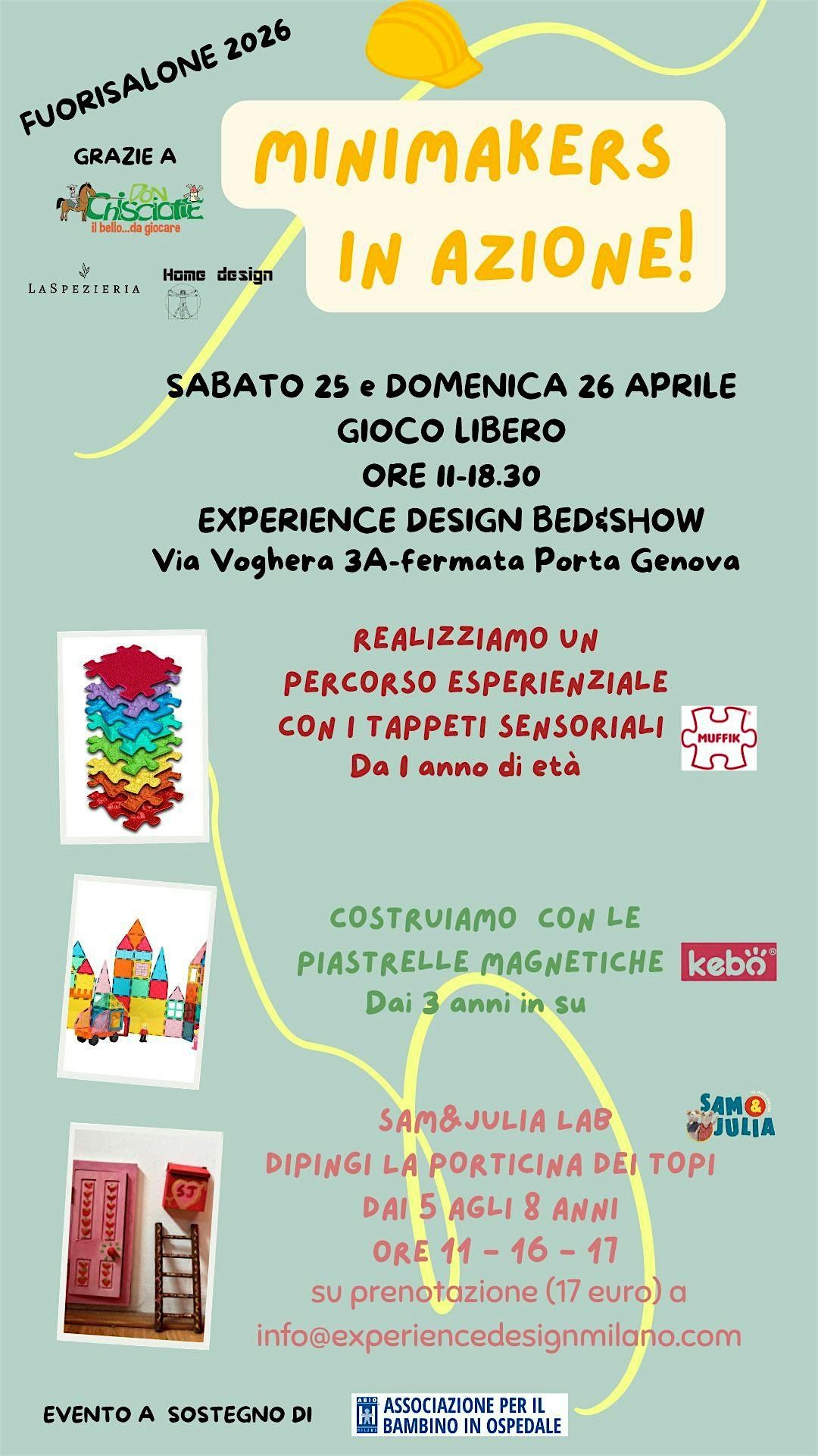In occasione della Design Week verrà realizzato un workshop della durata di 30 minuti circa, durante il quale i bambini potranno decorare e dipingere la porticina dei topi, la scala e la casella della posta che potranno poi portare a casa insieme al grembiulino usato durante l’attività.