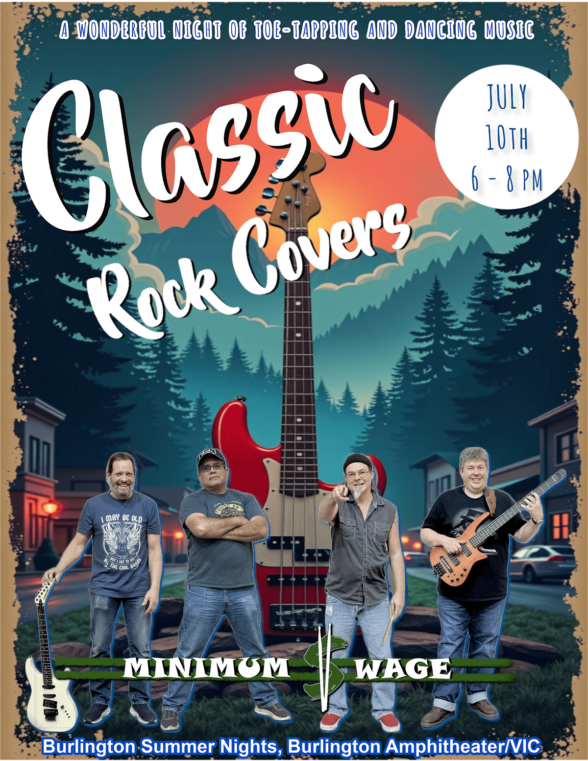 Get ready, Burlington! The Minimum Wage Band is back to rock the stage once again at Summer Nights. Join us for an awesome in-person show filled with great vibes, catchy tunes, and a night you won’t forget. Bring your friends, enjoy the music, and let's make this summer unforgettable!