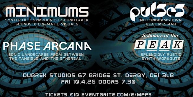 An evening of the most inventive electronica you'll find anywhere- at one of the best independent venues in the coutry. See the leftfield electronic musings of Scholars of the Peak, the ever-shifting tonal landscapes of Phase Arcana, the full on groove assault of Pulses and the majestic cinematic soundscapes of Minimums, all for only £10!