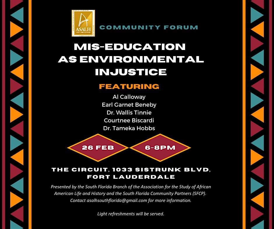 ASALH South Florida invites you to an evening of truth-telling, cultural grounding, and community dialogue as we explore how historical miseducation shapes today’s social and environmental realities—and how we can reclaim knowledge as a tool for liberation.
