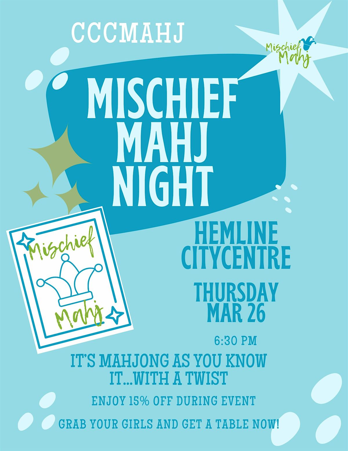Join us Thursday, March 26 at Hemline CityCentre for a night of shopping, mahjong & a little mischief! Know how to play and always wishing you could shake things up a bit? This is for you! The strategy is the same, we play the same NMJL card - we simply add a playful layer of surprise. You're sure to be in for a memorable night! Grab your girls and book a table now to get in on the mischief! Enjoy 15% off purchases during event. Come refresh your spring looks and your mahjong night at Hemline CityCentre!