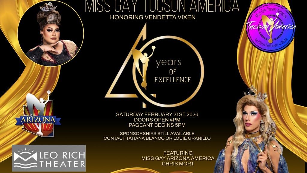 Miss Gay Tucson America was first crowned in September of 1986. That year Aviva Diamond won the title that would become Tucson's longest running female impersonator pageant. This year, we are celebrating 40 years of legacy. Miss Gay Tucson America is an official preliminary to Miss Gay Arizona America. Honoring Miss Gay Tucson America 2025 Vendetta Vixen. Featuring our Symbol of Excellence Miss Gay Arizona America Chris Mort.