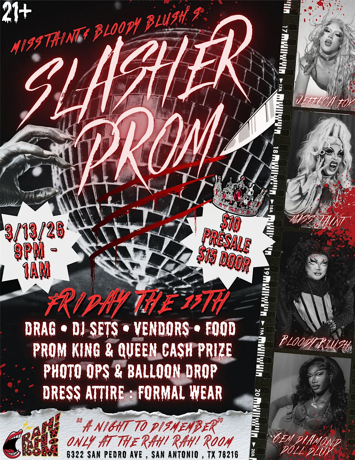 Expect dark humor, fierce performances, bloody good costumes, and acts inspired by classic slasher films and midnight nightmares. This is drag with a body count — playful, provocative, and just the right amount of wicked.