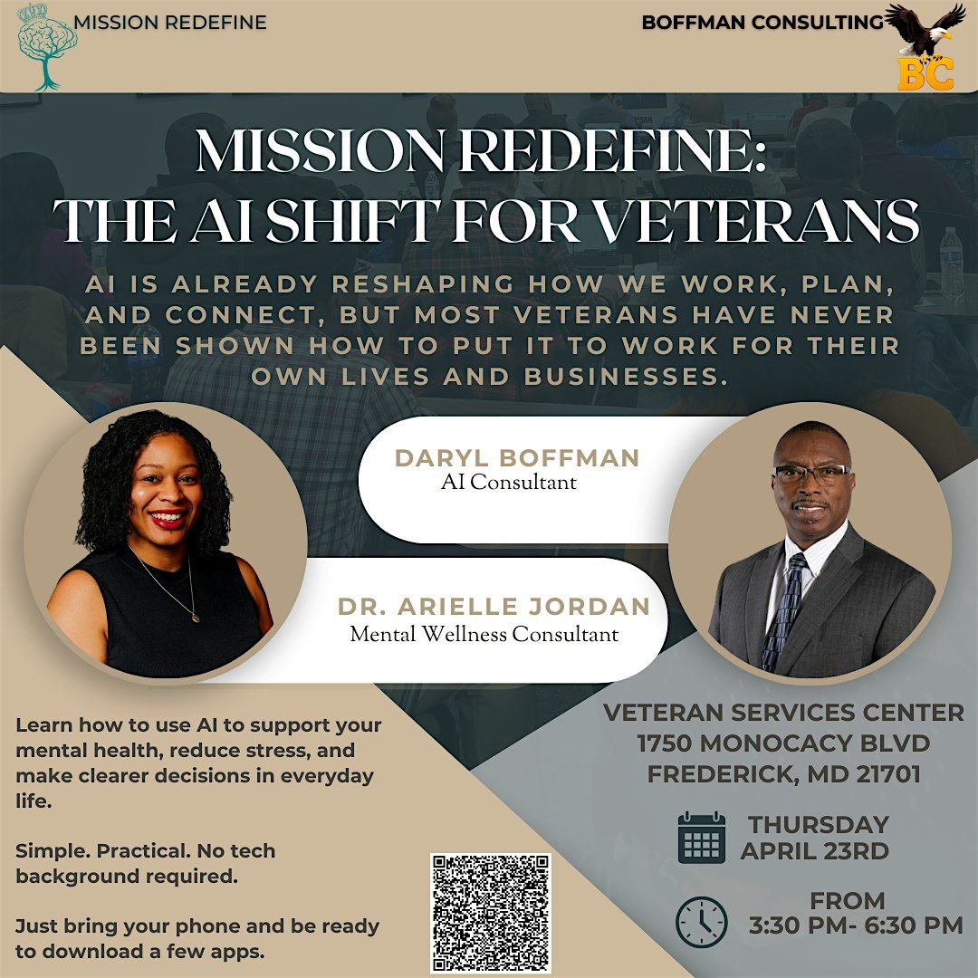 AI is already reshaping how we work, plan, and connect, but most veterans have never been shown how to put it to work for their own lives and businesses. In this workshop, veterans will learn how to use AI to support their mental health, reduce stress, and make clearer decisions in everyday life. Bring your phone and be ready to download a few apps. This is a hands on training class.