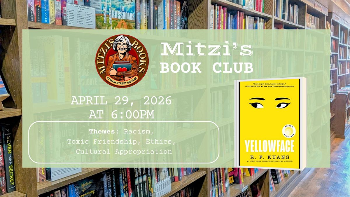 Join us at Mitzi's Books on April 29, 2026 at 6:00 PM (Mountain Time) for a fun and relaxed book club meeting! We'll dive into Yellowface, a satirical thriller set in the world of publishing by R.F. Kuang. Whether you're a longtime fan or new to the club, come share your thoughts, meet fellow readers, and enjoy great conversation. Refreshments provided!