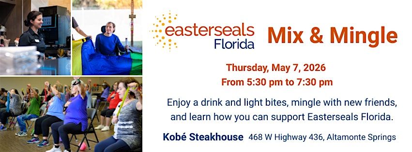 Welcome to the mix and mingle event happening at Kobe Steakhouse (468 W Highway 436, Altamonte Springs, FL) on May 7, 2026, starting at 5:30 PM! Meet new friends, reconnect with familiar faces, and learn how Easterseals Florida is making a difference for people with disabilities in Central Florida. Whether you’re a long-time supporter or just curious to learn more, this is the perfect chance to mix, mingle, and make an impact!