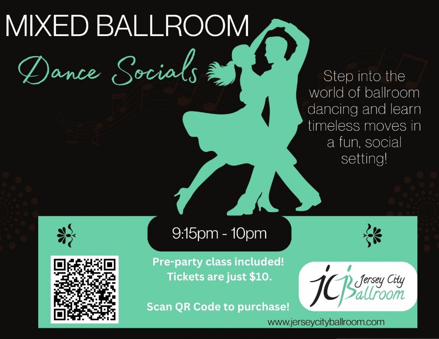 Join us for our MIXED BALLROOM DANCE SOCIAL - from elegant Waltz and Tango to playful Swing, sensual Rumba, spirited Cha Cha, and favorites like Salsa and Bachata. No partner, no worries! Dancers rotate often, making it easy to meet new friends. Wednesday APRIL 22nd 9:15-10pm. $10 per person!