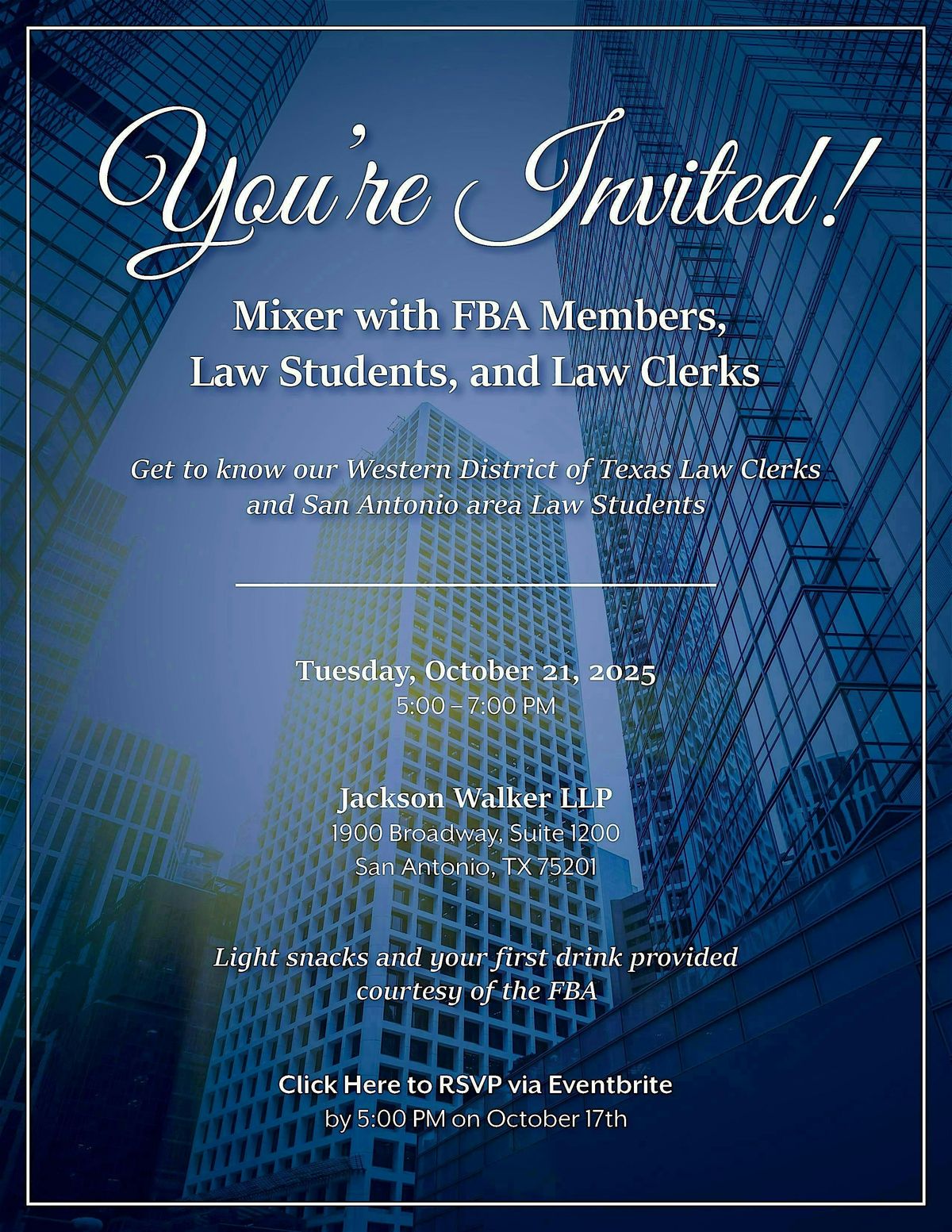 The San Antonio Chapter of the Federal Bar Association is hosting a mixer event with San Antonio FBA attorneys, law clerks, and law students. Please join us from 5:00-7:00 PM at Jackson Walker for drinks, appetizers, and lively conversation. Registration comes with one drink ticket provided courtesy of the FBA.