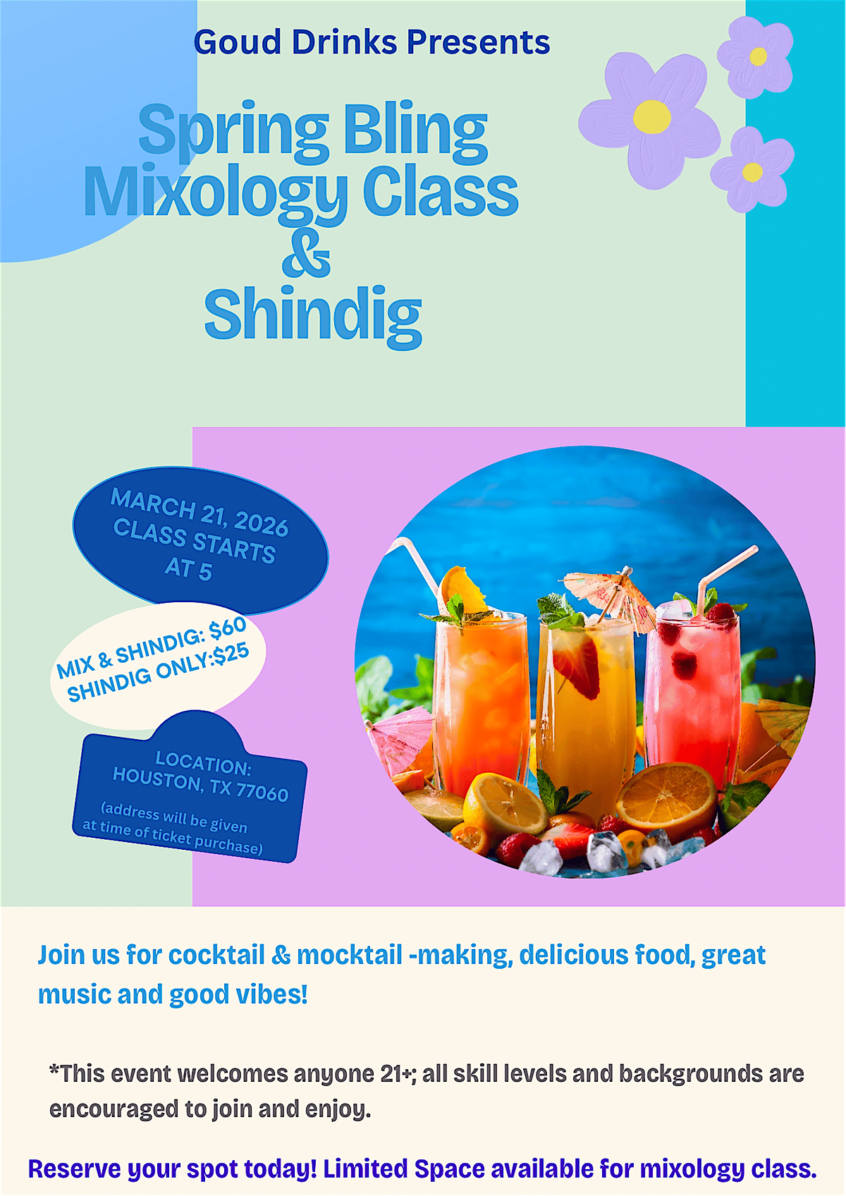 Join us for a spring-themed mixology class! Learn to make cocktails, followed by food, drinks, and music. Enjoy the fun!