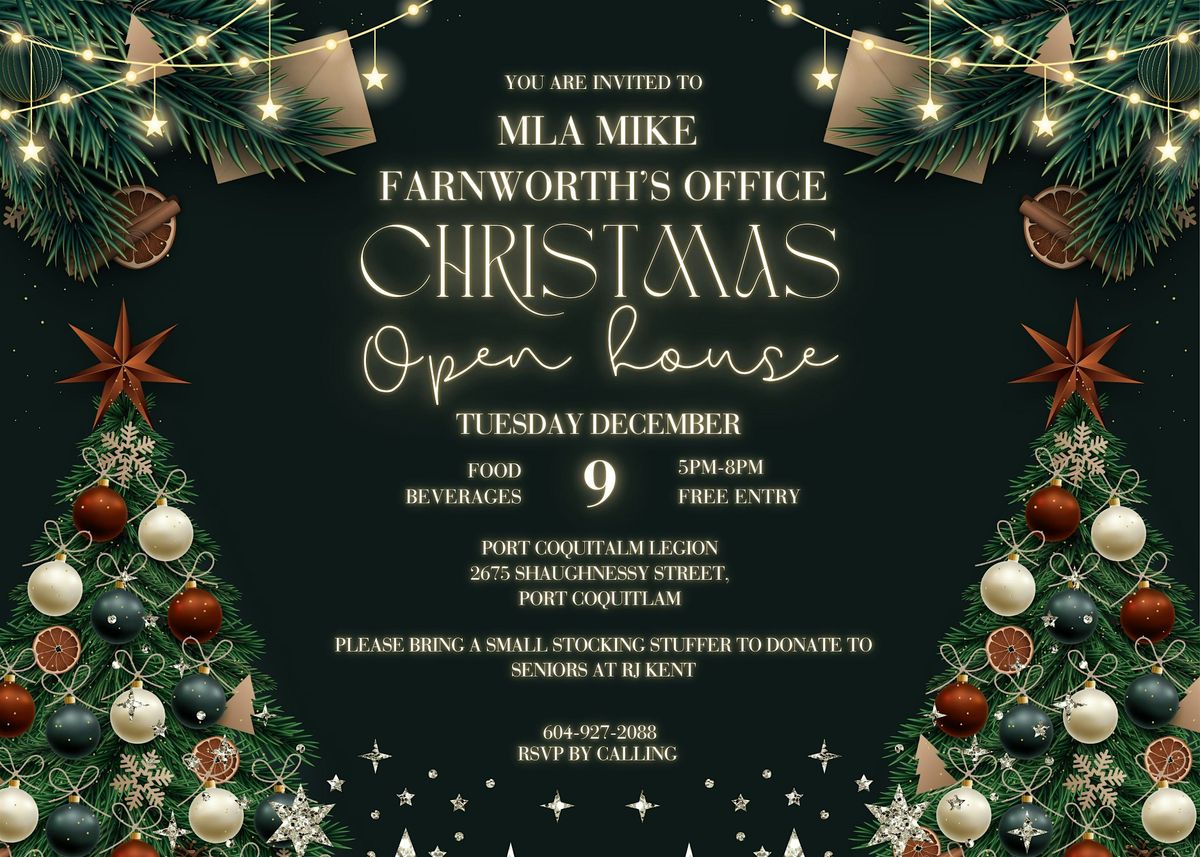 Join us for MLA Mike Farnworth's Office Christmas Open House at the Port Coquitlam Legion! Let's celebrate the holiday season together with festive decorations, delicious food, and great company. This in-person event is the perfect opportunity to mingle and spread some holiday cheer. Don't miss out on the fun - mark your calendars and come ready to enjoy a jolly good time! This year we will be collecting stocking stuffer donations for the Seniors at RJ Kent. If you are able we ask that you please bring a small item to brighten a seniors Holidays. Some ideas of items that seniors may need are: socks, slipper, gloves, scarves, umbrellas, toothpaste, compression hose, etc. Hope to see you there!