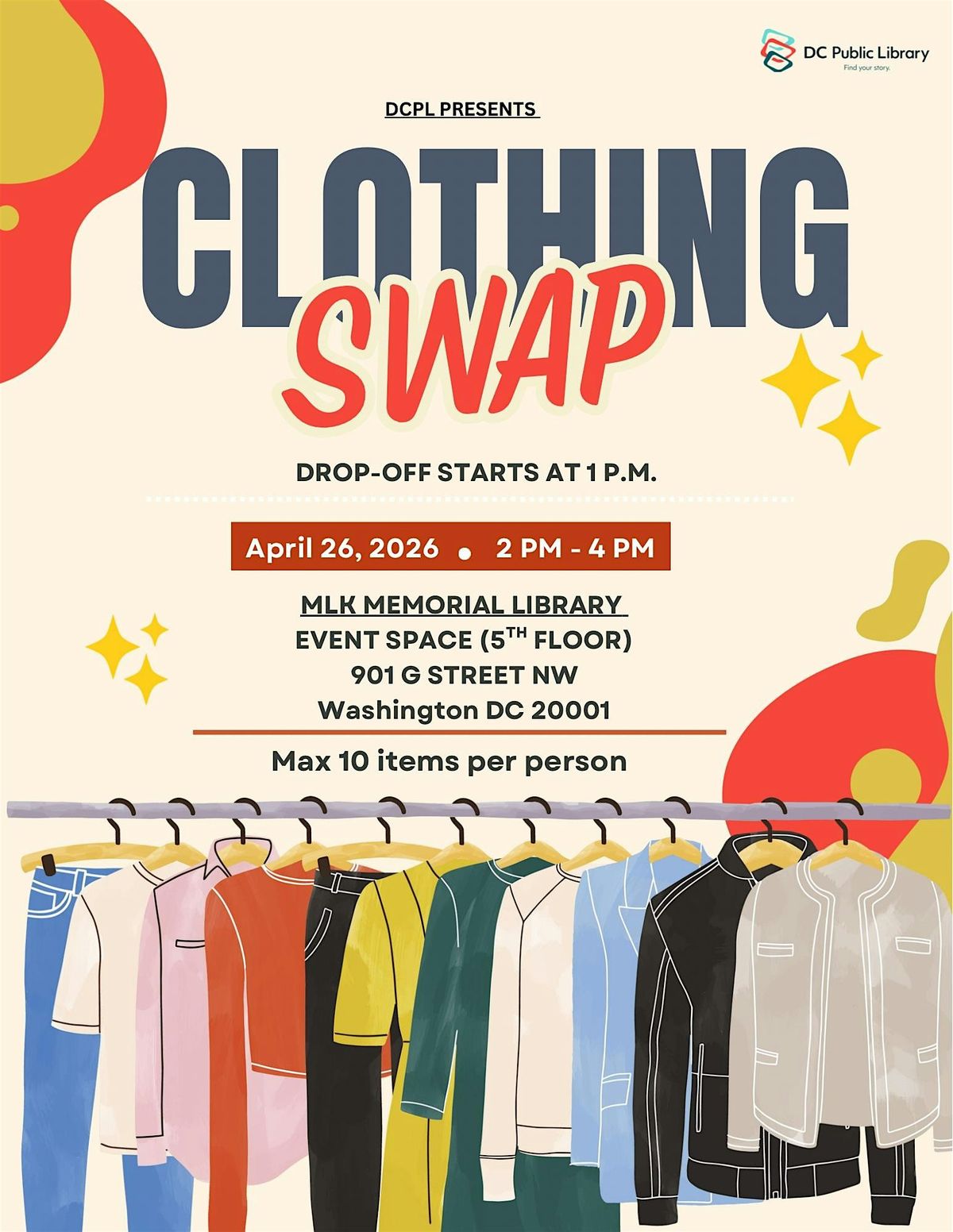Join us at MLK Library for a clothing swap where you can exchange your pre-loved clothing for new-to-you treasures. Whether you're looking to declutter or find some unique pieces, this event is perfect for all fashion enthusiasts.
