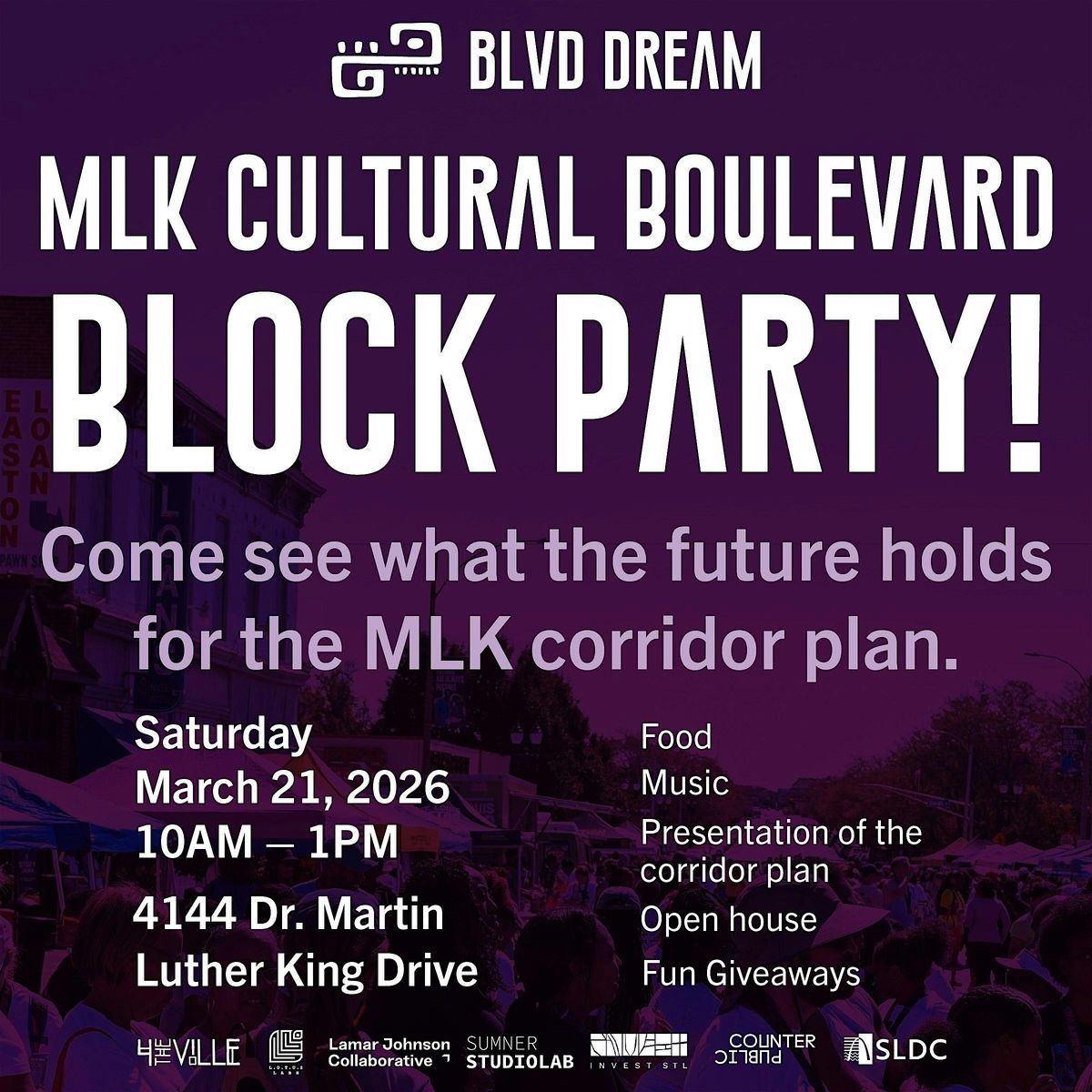 The Cultural Blvd Plan is nearing completion, and we want to celebrate with our neighbors! Join us at the Blvd Dream Info Center on March 21st for updates and a good time! We will celebrate completion of the corridor plan with food, music, giveaways, and a preview of new activations that are soon to come!
