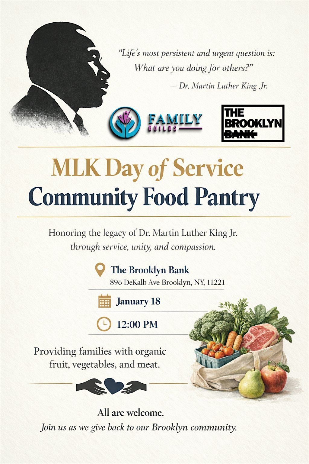 Get ready to join us for a Food Pantry, where we'll be spreading love and sharing fresh fruits, vegetables, and meat with the community!