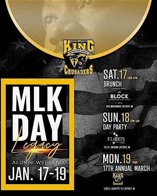 The MLK Alumni Board will be hosting a brunch on Saturday, January 17, 2026 from 11 am -4pm at The Block located at 3919 Woodward in Detroit. Upon entry, a $10 donation will help us continue to serve and give back to our school and current student body. Food and drinks will be available at an additional cost. Your $10 donation will also gain you free entrance for the day party from 3-5pm only @ Floods on Sunday, January 18, 2026. If you arrive after 5pm, there will be a cover charge from Floods.
