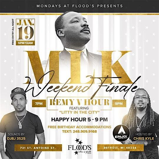 Join us for an unforgettable MLK Weekend finale right at Flood's Bar & Grille! Mondays at Flood's is the best vibe in the city every Monday night. Come wrap up the weekend with good vibes, great company, and awesome drinks. Don't miss out on the fun – come hang out, celebrate, and make some memories! Hosted by Chris Kyle, Sounds by DJBJ. Guest Host Myles the Prince.