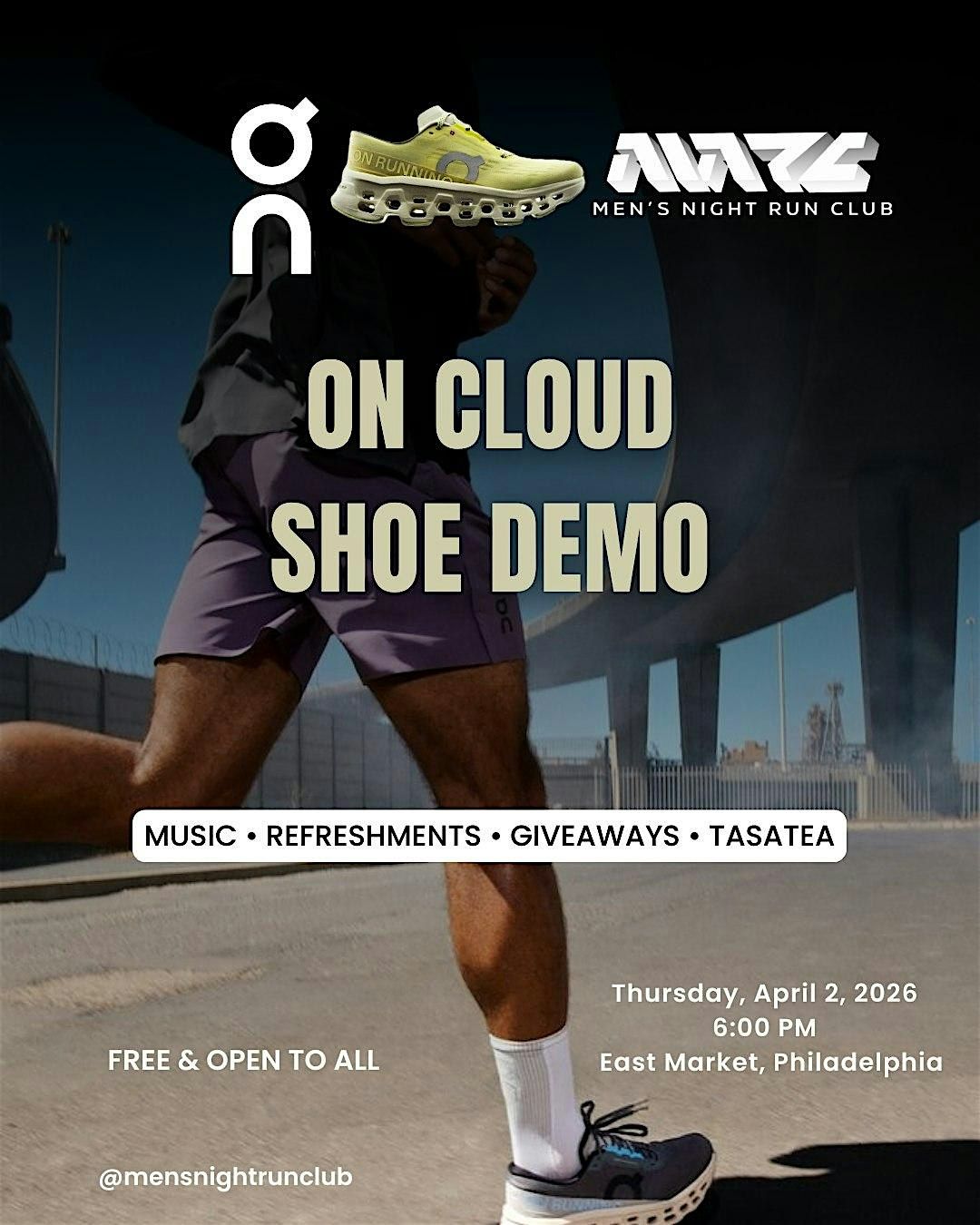 Join Men’s Night Run Club for a special collaboration with ON at East Market in Philadelphia. This exclusive Shoe Demo experience gives runners the opportunity to test out three different ON sneaker models in a real run setting.