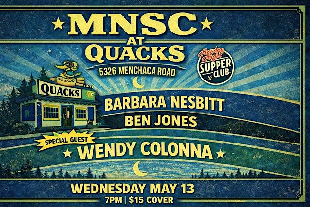 Ben Jones and Barbara Nesbitt, hosts of the popular MNSC (Monday Night Supper Club), will be bringing their show to Sound Space at Captain Quackâs for a special evening of music and storytelling. The event will feature the amazing guest artist Wendy Colonna.