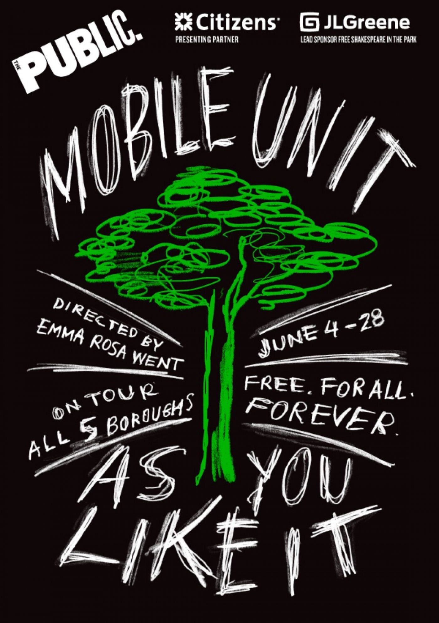 Bringing free Shakespeare to parks and correctional facilities across the city, The Public’s acclaimed Mobile Unit will tour in 2026 with a joyful new production of AS YOU LIKE IT. True lovers, strange capers, and fools in the forest go heart-in-heart in Shakespeare’s classic romantic comedy, directed by The Public's inaugural Directing Fellow Emma Rosa Went.