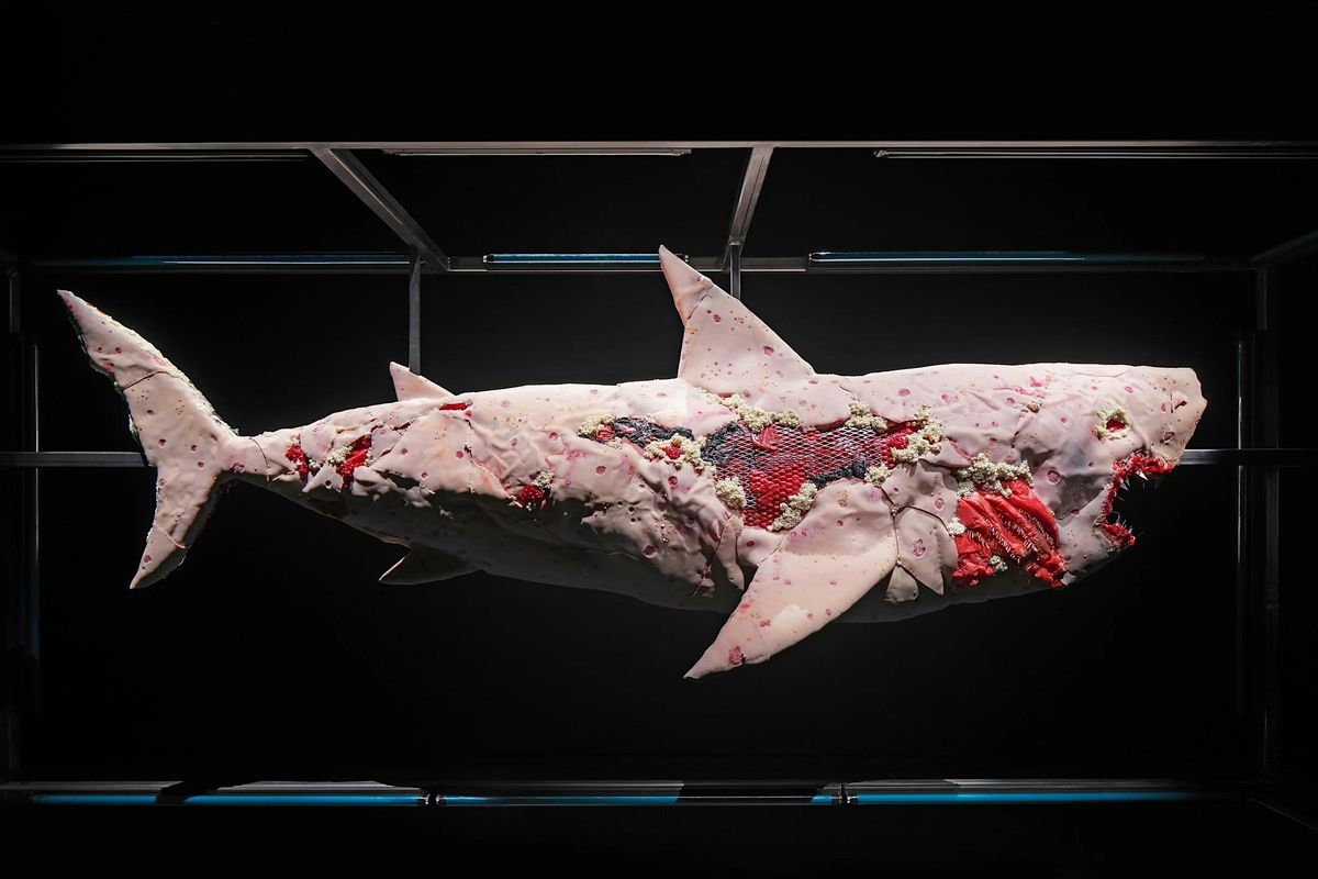 KING COBRA, When You Are Between The Devil And The Deep Blue Sea, 2022. Silicone, urethane foam, pearls, hair weave, epoxy resin, beads, razor blades, fluorescent lights, steel, 67 x 156 x 42 inches; John Sabraw, A Spell, 2025. Acrylic and oil with AMD pigments and bituminous coal on canvas, 72 x 144 x 1.5 inches. Image courtesy of the artist; Sky Hopinka, Hihižąkicųšgųnįeja, 2024. Unique inkjet with hand-scratched text and UV treatment, 52 1/4 x 124 3/4 inches. Courtesy of Broadway Gallery, LLC; Homing Instinct (Video still).