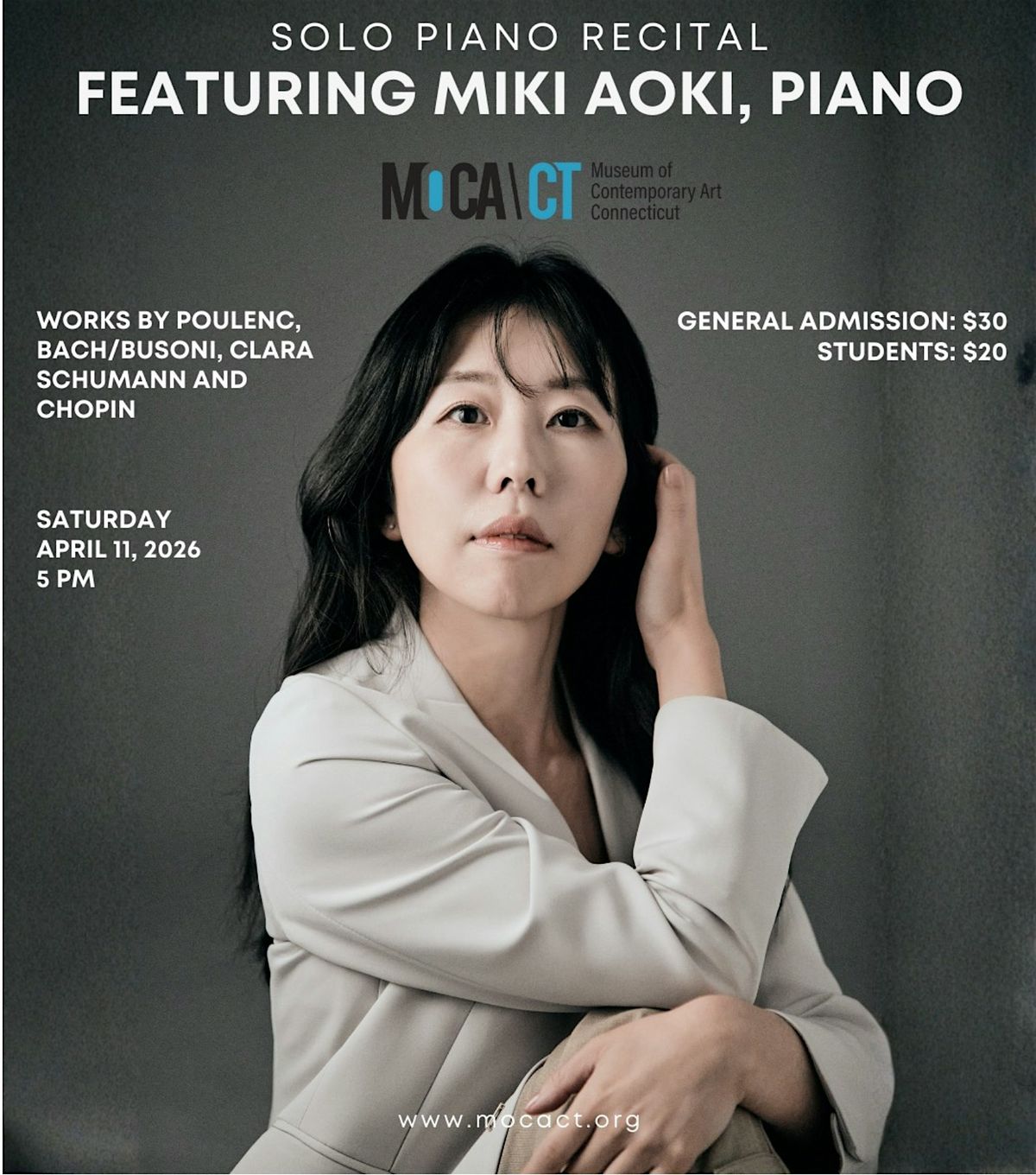 Join us in person for an intimate evening with Miki Aoki as she takes the stage for a solo piano session. Experience her unique style up close and let the music sweep you away. Perfect for fans of soulful, captivating piano performances. Don't miss this chance to enjoy an amazing live show at MoCA\CT!